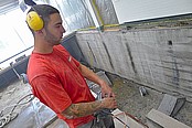 Eine schweiss-treibende Arbeit - der alte Boden des Showrooms kommt raus. Die beiden Spezialisten sind konzentriert bei der Arbeit und demontieren was das Zeug hält.