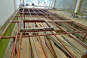 Heute wurde Armierungs-Eisen verlegt, Leitungsrohre eingezogen und der Betonboden gegossen. Jetzt nimmt alles Gestalt langsam an - die schöne Werkstatt-Fläche wird erkennbar!