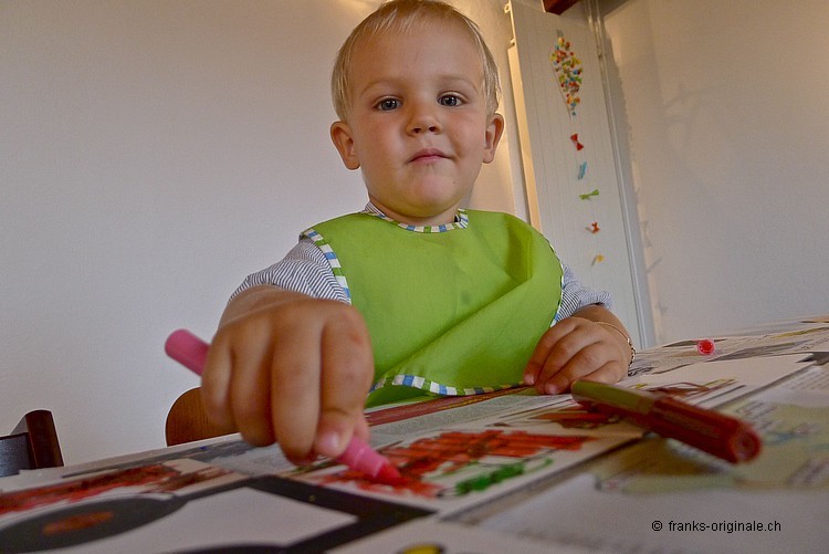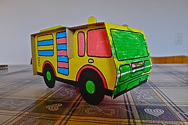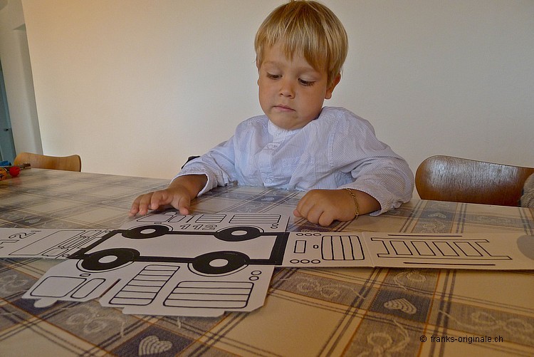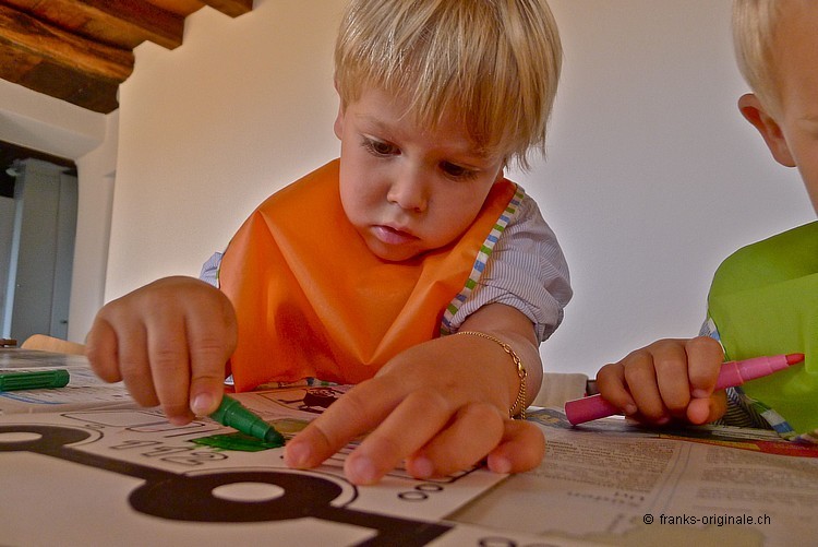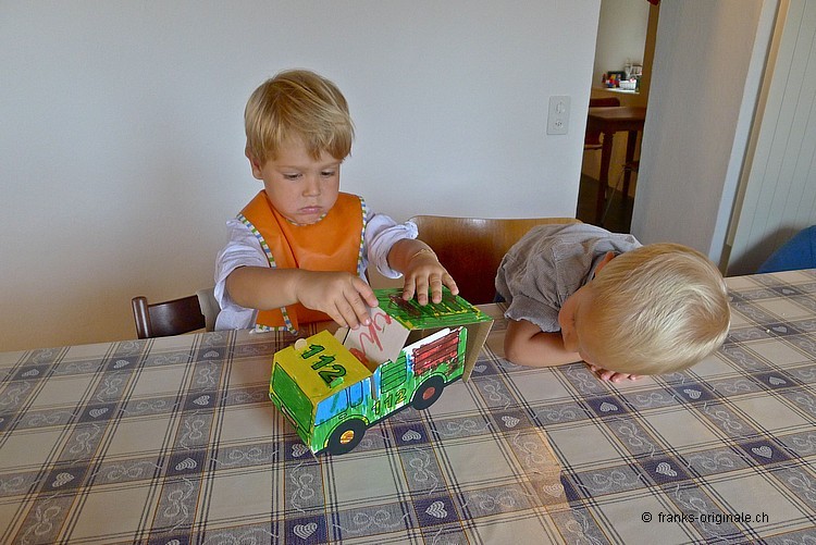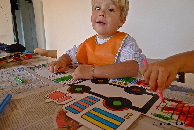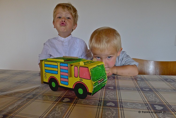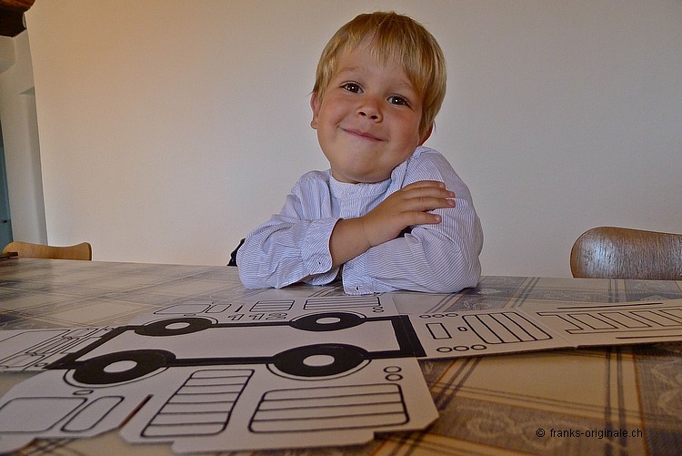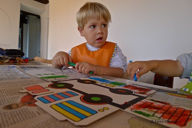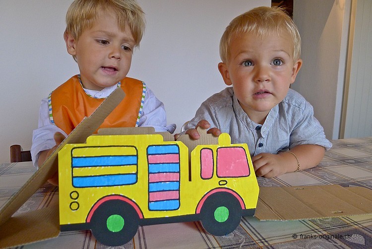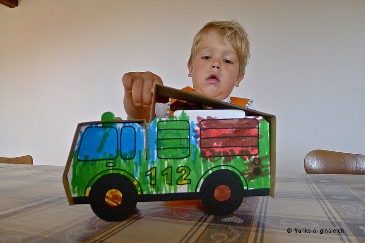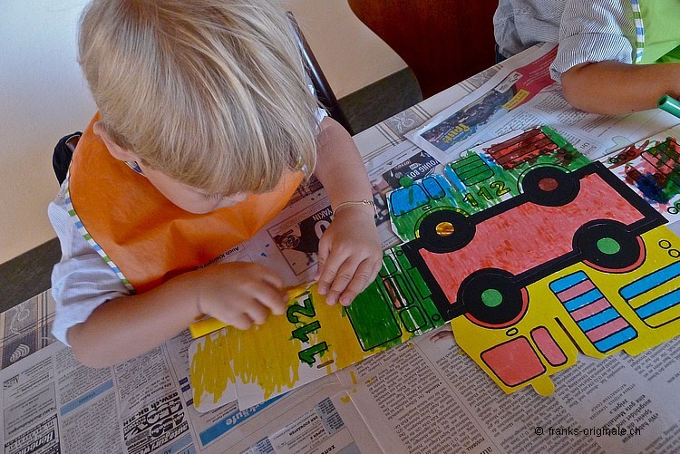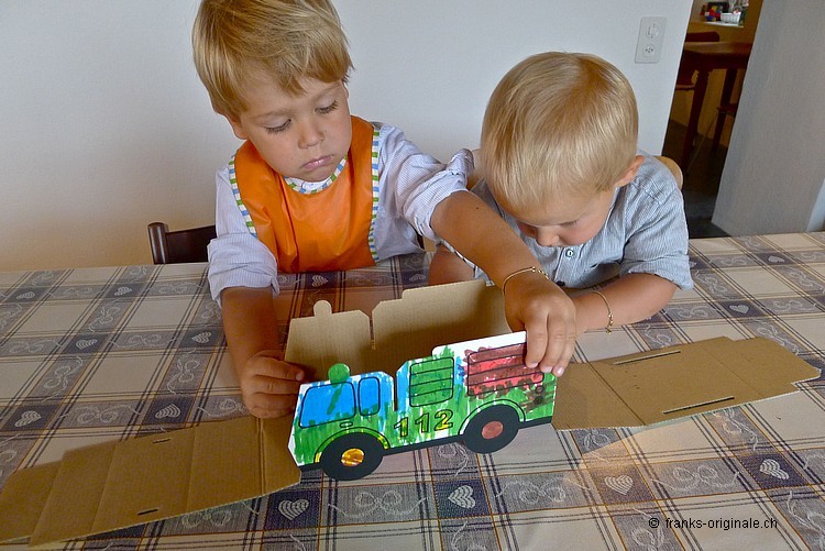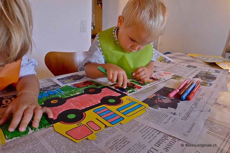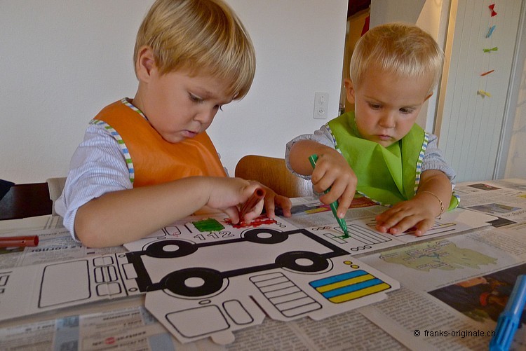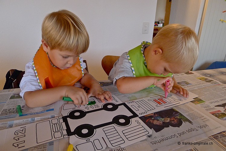 Mit viel Elan, vielen Farbstiften, einer guten Falt- und Ausmal-Vorlage und mit viel Zeit entsteht ein wunderschönes Feuerwehrauto. Die beiden Jungs sind sichtlich konzentriert und begeistert zugleich und nehmen die Herausforderung an. Es macht viel Spass, etwas selber zu gestalten und zu kreieren. Und das Resultat kann sich mehr als sehen lassen. Gratulation, meine lieben Buben!