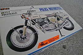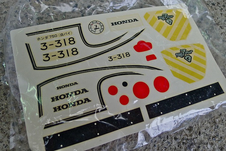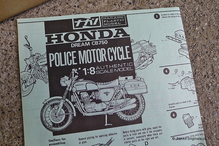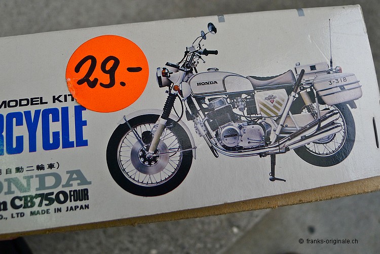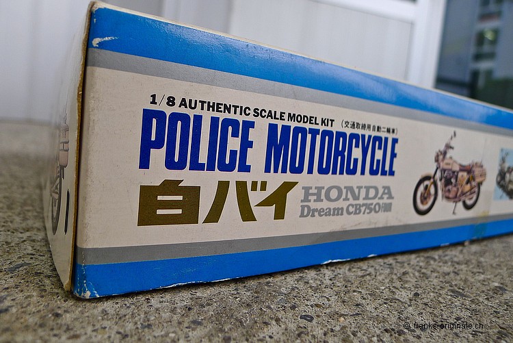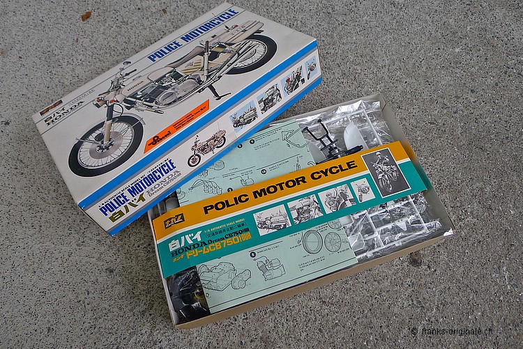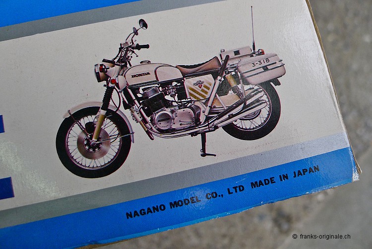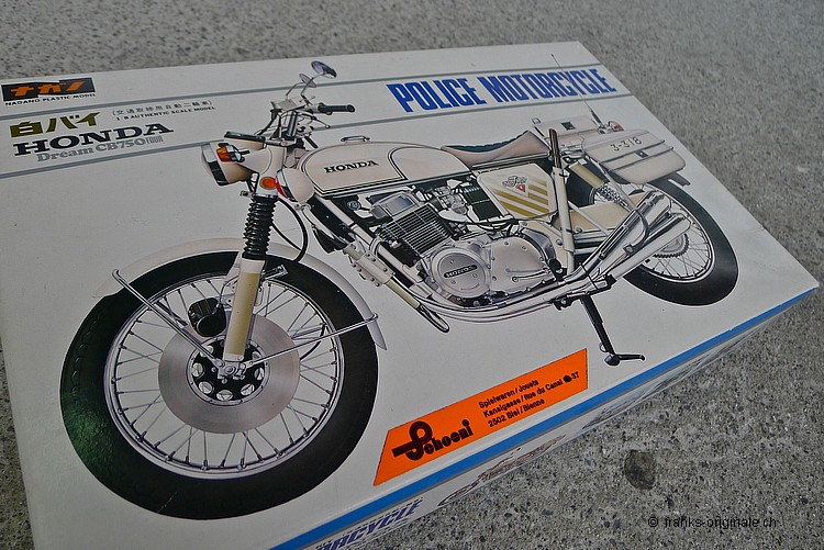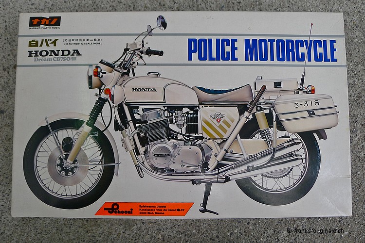 Der Klassiker aus den 70er Jahren - ein Modellbausatz einer HONDA CB 750 Four im Masstab 1:8 in der seltenen Polizei-Version. Der Baukasten von der Firma Nagano PLastic Model ist komplett - alle Teile sind noch neu, eingeschweisst und somit originalverpackt. Das freut uns natürlich ganz besonders. Denn das gleiche Modell haben wir im Masstab 1:1 bei uns in der Ausstellung. Die ganze Geschichte um schöne Motorräder und die dazu passenden Modell-Baukästen war und ist noch immer kult! Ausgefallene und besonders schöne Modelle werden nicht nur im Original sondern auch als Modell gesucht. Und die Modelle sind Sammlerware und werden von einer eingefleischten Fan-Gemeinde gejagt. Uns gefallen diese Dinger ganz einfach besonders gut. Wir haben viel Freude - noch mehr wenn wir ein Modell finden, das zu einem unserer Angebote passt. So wie die Polizei-HONDA. Eigentlich wären Baukasten-Modelle dafür gedacht, dass diese zusammen gebaut würden. Wir persönlich finden, dass das zu schade wäre und lassen den Baukasten in seinem originalen und bestens erhaltenen Zustand. Wir geniessen die schönen Bilder ab der Box und lassen uns in der Stille von den Gedanken über die Strasse leiten. Geniessen Sie die Bilder ... liebe Grüsse aus Kriens und nachträglich noch ein gutes neues Jahr. Zwar etwas spät - dafür um so herzlicher! Wir sind ab sofort wieder für Sie da und freuen uns auf Ihren Kontakt! Bis bald, Frank