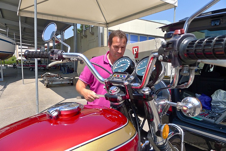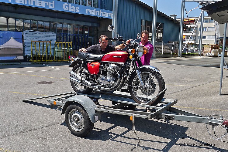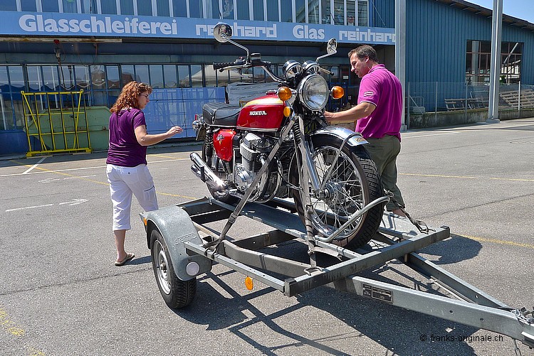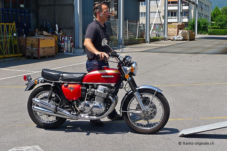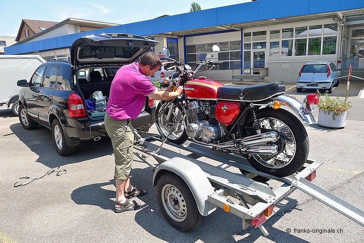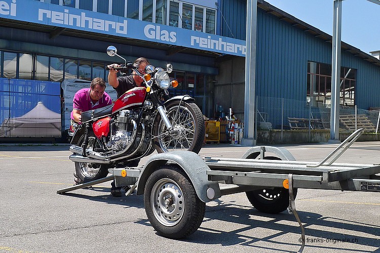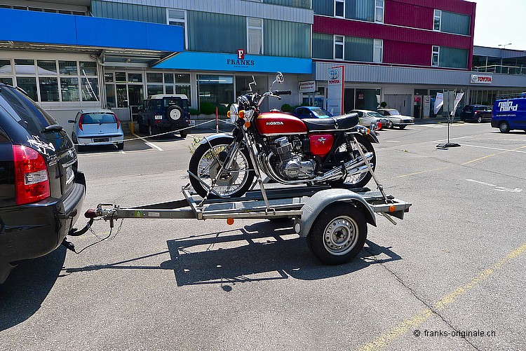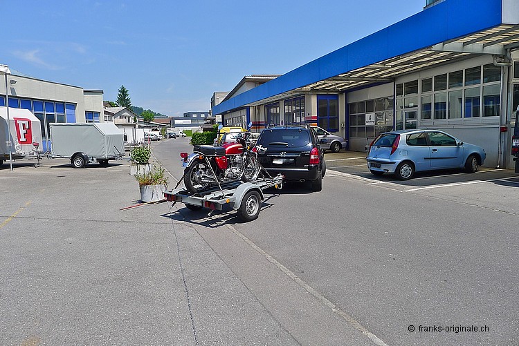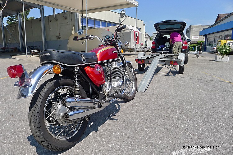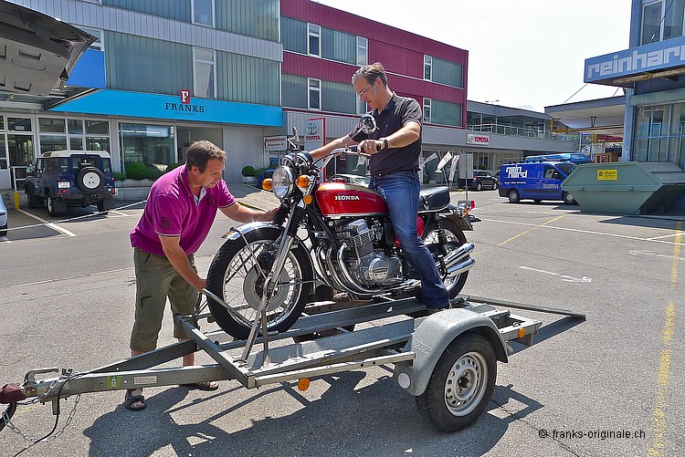 Wir bedanken uns ganz herzlich für die angenehme Zusammenarbeit und für den Kauf der 750er HONDA. Es freut uns sehr, dass dieser Klassiker in sehr gute Hände kommt. Unsere Four wurde vor der Auslieferung nochmals sorgfältig vom Spezialisten geprüft und MFK-Veteranen-tauglich gemacht. Dies natürlich ohne Beanstandung und Probleme! Nun geben wir eine feine und ehrliche HONDA K2 mit einem sehr guten Gefühl in die Sorgfalt der neuen Besitzer. Das Bike ist aufgeladen, festgezurrt und fixiert - fertig und Abfahrt nach Hause. Bleibt uns nur noch alles Gute und viel Spass auf den künftigen Ausfahrten zu wünschen. Freundliche Grüsse aus Kriens und bis bald wieder einmal @ FRANKS ;-) Frank Lutz
