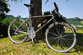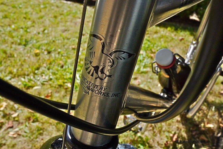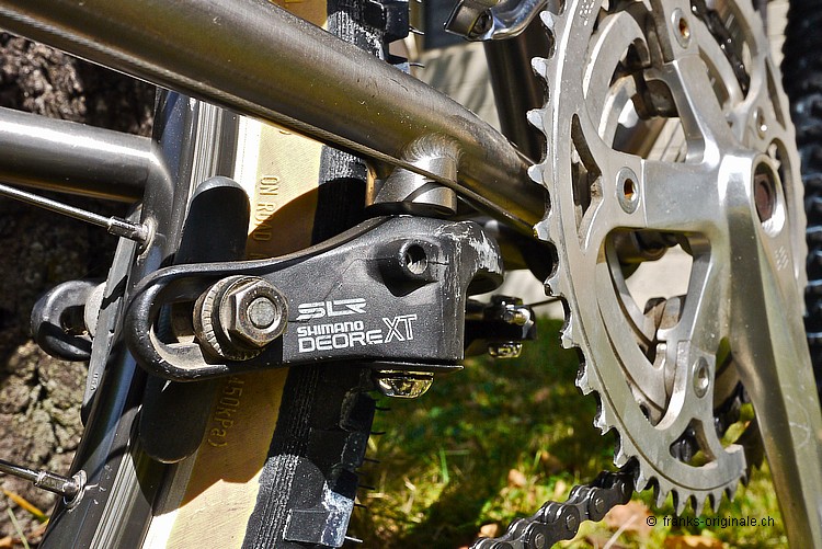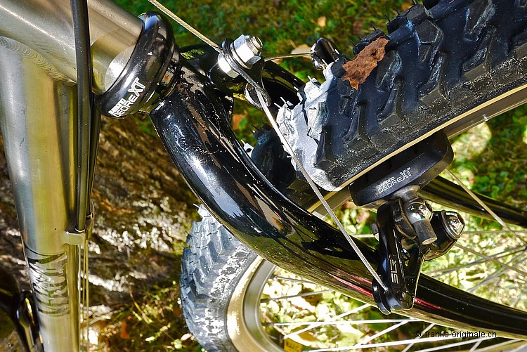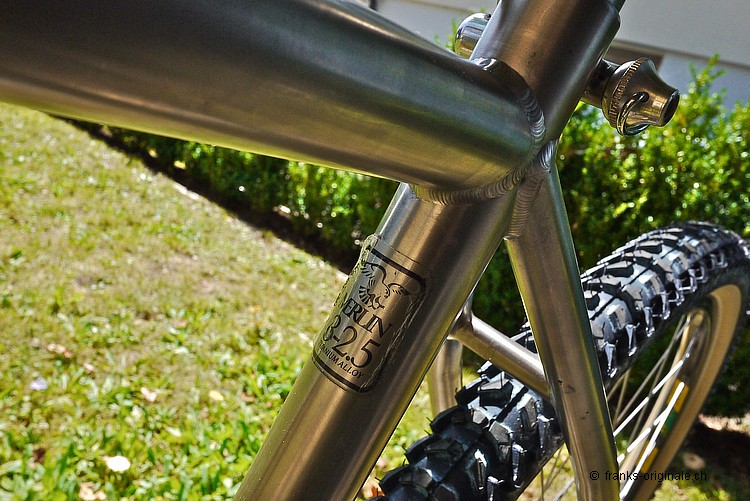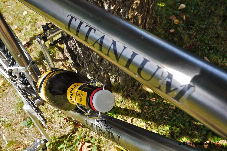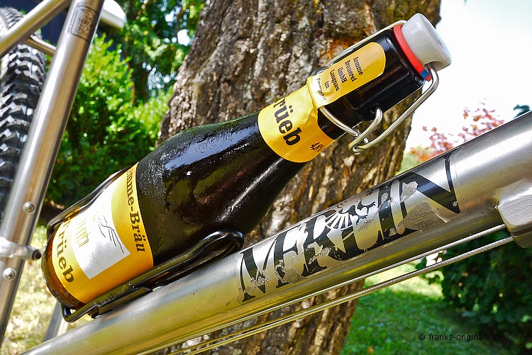 Am Sonntag-Nachmittag war es endlich soweit - ich durfte mein neues Edel-Mountain-Bike MERLIN entgegen nehmen. Ein MERLIN-Titan-Bike aus dem Jahre 1989. Eines der Erstgebauten noch dazu! Im Bidon-Halter ist ebenfalls Edel-Saft zu finden - ein wohltuend und kühles Emmenbräu aus Langenthal. Meist getrunken auf dem Napf bei der Stächelegg - am Schluss unserer Biketouren durch das schöne Napfbergland! Hezlichen Dank dem Spender - Stefan Scherzinger! Die Titanschmiede MERLIN war und ist noch immer bekannt dafür, dass sie das Edelmetall Titan in perfektion verarbeiten konnten. In den Anfangzeiten der Mountain-Bike-Ära war es ein absolutes Novum, Bikes aus Titan zu fertigen. Das Resultat war ein super leichtes und sehr stabiles Bike, das gerade mal etwas unter 11 Kilogramm auf die Waage brachte. Ein richtiger Racer also ... Unser MERLIN stammt aus dem Jahre 1989 - also aus der Anfangszeit der Firmengründung. Wir haben dieses Bike in unserem Netzwerk www.oldschoolracing.ch gefunden. Das Rahmen-, Gabel- und Vorbauset stand als Basis zur Weiterverarbeitung. Die fehlenden Komponenten haben wir mit den besten Shimano-Parts des gleichen Jahrgangs aufgebaut. Sogar die Sattelstütze ist ein Jahrgänger und natürlich ebenfalls aus Titan gefertigt. Etwas zur Geschichte von MERLIN Die Firma MERLIN Metalworks wurde 1986 von Gwyn Jones, Gary Helfrich und Mike Augspurger gegründet. MERLIN produzierte ihre ersten Titanium-MTB-Rahmen aus Flugzeug-Hydraulik-Rohren. Das waren damals die einzigen Rohre, die für ein solches Projekt geeignet waren und die hohen Anforderungen erfüllten. Die Verwendung dieser Rohre hatte zur Folge, dass das Ober-, das Unter- und das Steuerrohr sowie das Tretlagergehäuse aus dem selben Rohr mit dem selben Durchmesser verarbeitet wurde. Das Sattelrohr und die Kettenstreben hatten somit die nächst kleineren Durchmesser. Der erste Auftrag, der an MERLIN ging, kam von Marin. Marin bestellten anfänglich gerade mal 200 Stück dieser neuen Rahmen - damit sollte ihr Topmodell ausrüsten werden. Biken im Willisauer Hinterland - Oldschoolracing.ch Oldschoolracing.ch ist eine Vereinigung von drei leidenschaftlichen Bikesammlern und -Fahrern - Stefan Scherzinger, Bedrich Steimann und Frank Lutz - Frank von FRANKS Originale ;-). Auf der Homepage von Oldschoolracing.ch finden Sie eine Vielzahl von sehr seltenen, schönen und gut erhaltenen Mountain-Bikes aus den Anfängen der Szene. Die ganze Sammlung umfasst ca. 60 bis 70 klassische Mountain-Bikes. Diese ist zwar noch nicht komplett - sehr Vieles und Seltenes ist jedoch schon vorhanden und auf dieser Website präsentiert. Wer sich also gerne einen Überblick über die gesamte Mountain-Bike-Szene machen möchte, der muss diese Homepage einfach gesehen haben!