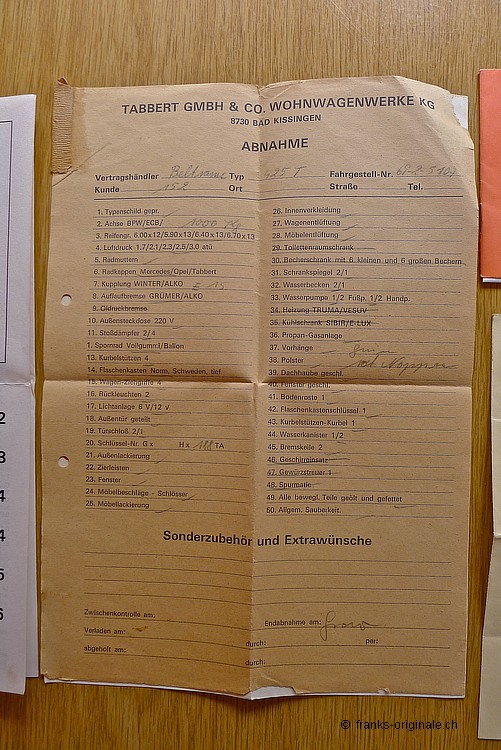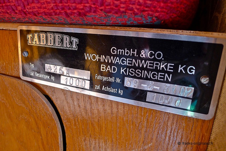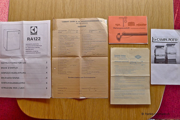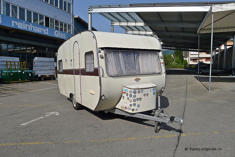 Unser Tabbert wurde ursprünglich in Deutschland gefertigt und via Schweizer Händer in die Schweiz dem Erstbesitzer geliefert. Ein Schweizer Wohnwagen also ... alles noch im schön und originalen Zustand - sehr gepflegt und überzeugend in der Ausstrahlung. Der Tabbert wurde letztmals im 2010 auf dem Strassenverkehrsamt geprüft und anhand des überzeugend guten Zustand mit Veteranen-Status belohnt! Der Tabbert ist komplett! Will heissen - ein grosses Vorzelt ist mit dabei, die soeben gemachte MFK-Prüfung als Veteran und viele der Originaldokumente (siehe Fotos der Erstauslieferung). Viele Ausfahrten gemacht Anhand der verschiedenen Aufkleber kann man einige der schönen Destinationen, die der Tabbert in den vergangenen Jahren angefahren hat, nachvollziehen - an Erfahrung mangelt es diesem Klassiker also überhaupt nicht. Unseren schönen Tabbert konnten wir günstig erwerben - aus diesem Grund können wir den Wohnwagen-Klassiker auch zu einem attraktiven Preis anbieten. Einen klassischen Wohnwagen in diesem Zustand und unter CHF 5'000.- zu finden, kommt nicht alle Tage vor.