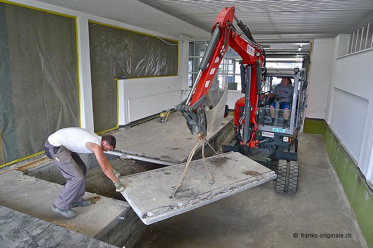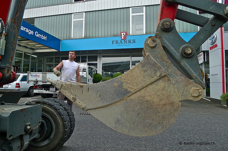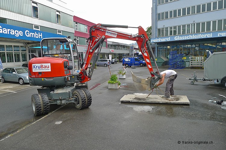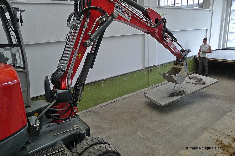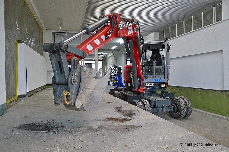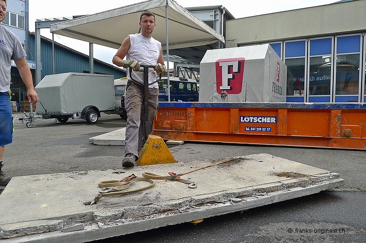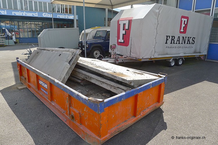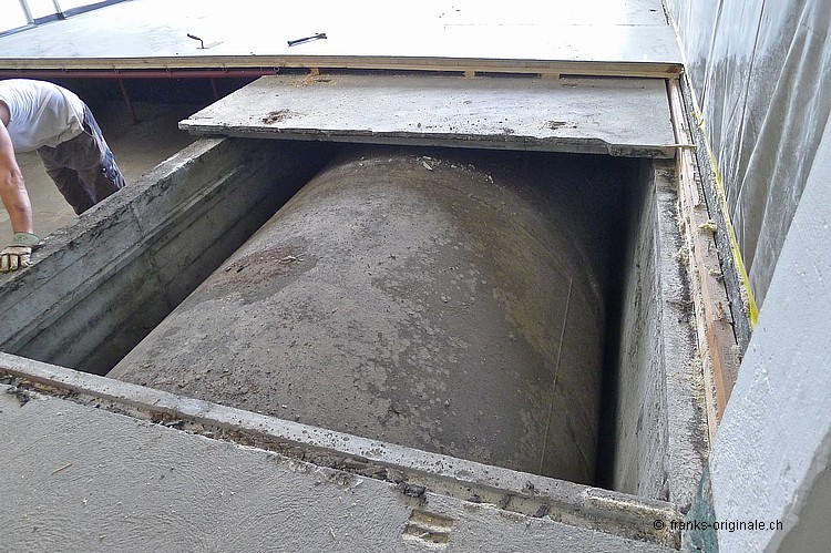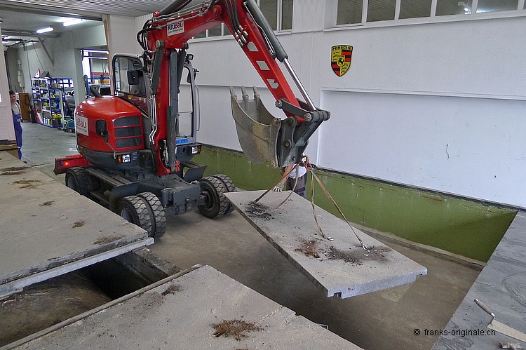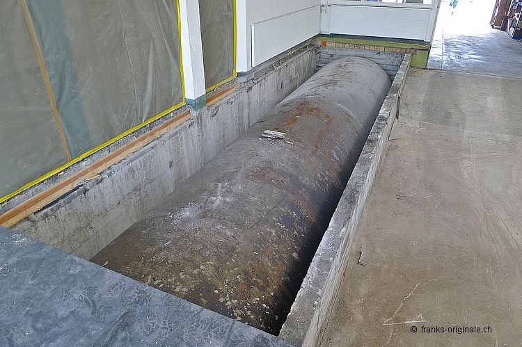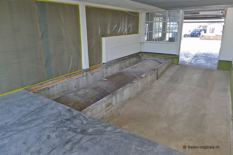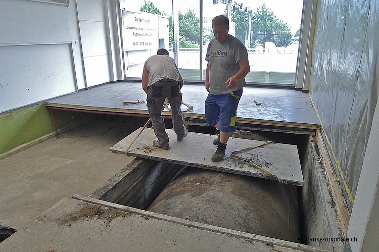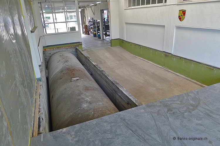 Für unsere neue Werkstatt benötigen wir jeden Quadratmeter an Fläche. So auch die Fläche, wo jetzt die Beton-Elemente und darunter ein ausgedienter Oeltank liegen. Über 50 Jahre soll der Oeltank schon da sein ... und der muss natürlich auch noch raus! Oeltank seit 1977 still gelegt! Kaum zu glauben, wie die Zeit vergeht. Der Oeltank wurde wahrscheinlich irgendwann in den 30er/40er Jahren beschafft und installiert. Seit 1977 ist dieser jedoch nicht mehr in Betriebe - gesäubert und stillgelegt. Bei Bauvorhaben in der heutigen Zeit kommen solche Trouvaillen wieder zum Vorschein - hurra, ein Oeltank ist da! Nur - die Freude hält sich bei uns in Grenzen .... Da liegt er nun - seit über 36 Jahren. Und bereit für die nächste Station: Demontage und Einschmelzung in etwas Neues! Aber der neue Raum ist visuell schon erfassbar und wir freuen uns auf unserem Weg zur Werkstatt. Die Spezialisten der KruBau müssen hart ran. Ruckzuck - die ersten Beton-Elemente sind schon draussen. Bis heute Abend soll der ganze Oeltank freigelegt sein! Schaun mer mal ... resp. let's kuck, wie man im Englischen so schön sagt! Die ganze Umbau-Geschichte können Sie auf unserer Homepage mitverfolgen - unter REFERENZEN / Franks Werkstatt sehen Sie alle Blogs dazu!