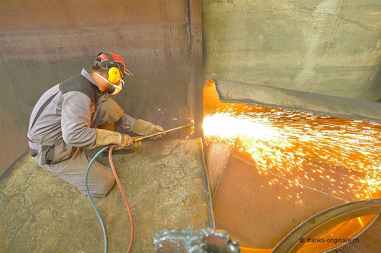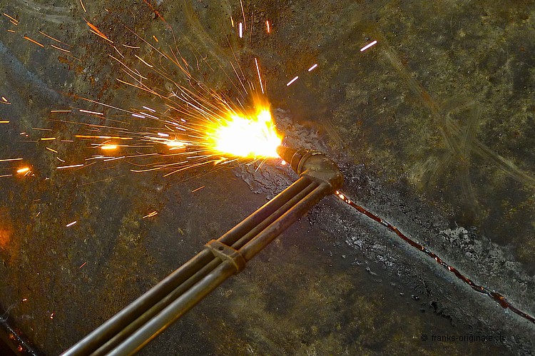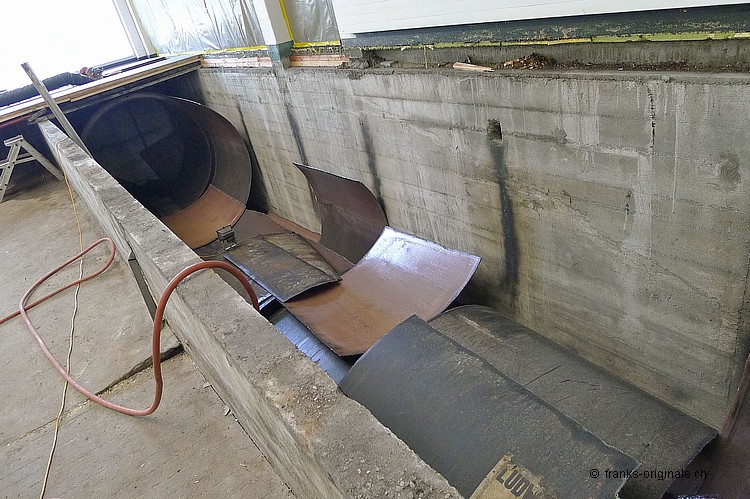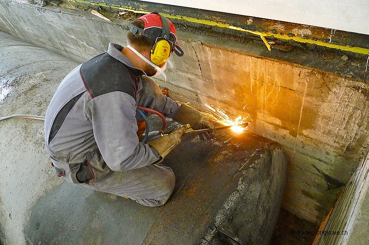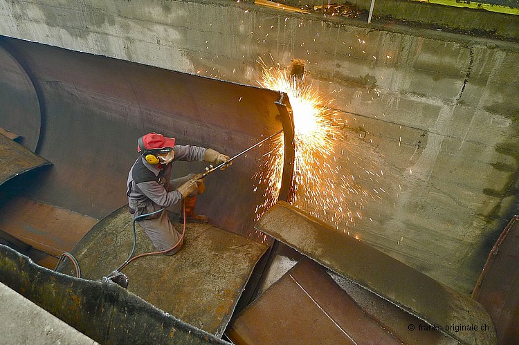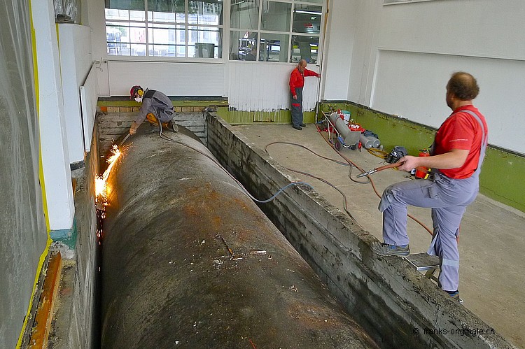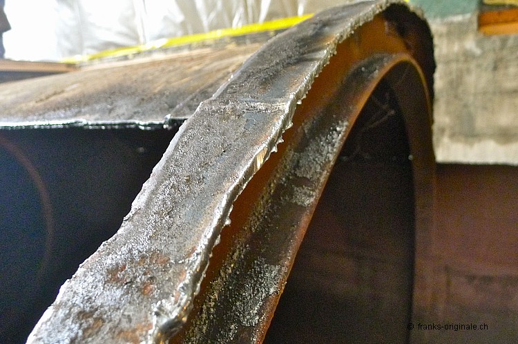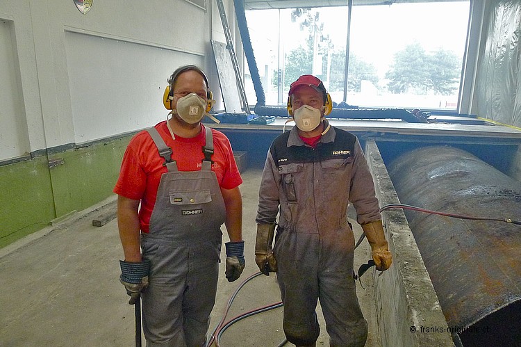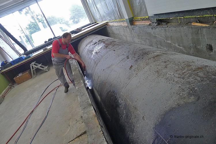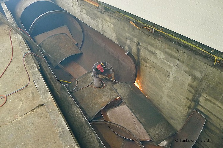 11 Meter Länge und 2.5 Meter im Durchmesser - das sind die Masse des riesen Oeltanks, der heute in viele handliche Stücke zerlegt wurde. Die beiden Arbeiter der Firma Röhner Gettnau haben dabei ganze Arbeit geleistet. Herzlichen Dank dafür! Klein - aber noch immer tonnenschwer! Für uns war dies ein eindrückiches Schauspiel. Die Schweissanlage vermochte die 5 Milimeter starke Wand des Oeltankes im Nu zu durchschneiden und aufzubrechen. Viel schneller als wir uns das vorstellen konnten .... und gegen den Abend war denn auch die grösste Arbeit schon gemacht. Die kleinen aber noch immer sehr schweren Eisenplatten liegen nun in der Wanne und warten auf den Abtransport durch den Alteisen-Sammler. Und der sollte dann morgen mit entsprechender Maschinerie bei FRANKS vorbei kommen. Mit einem Lastwagen und integriertem Kran/Greiffarm um die Eisenstücke aus der ca. 2.5 Meter tiefen Wanne heraus zu hieven. Wir sind gespannt - morgen gehts weiter! Die ganze Umbau-Geschichte können Sie auf unserer Homepage mitverfolgen - unter REFERENZEN / Franks Werkstatt sehen Sie alle Blogs dazu!