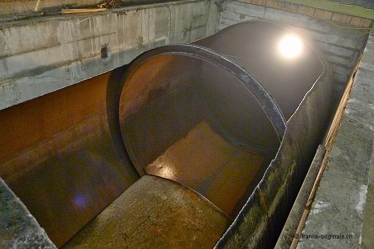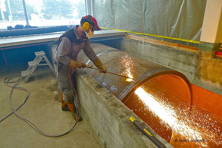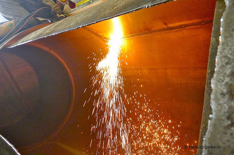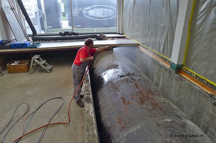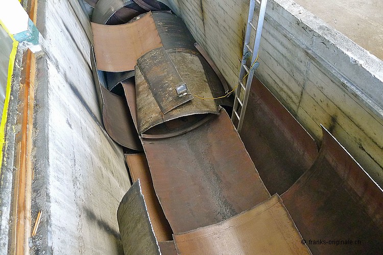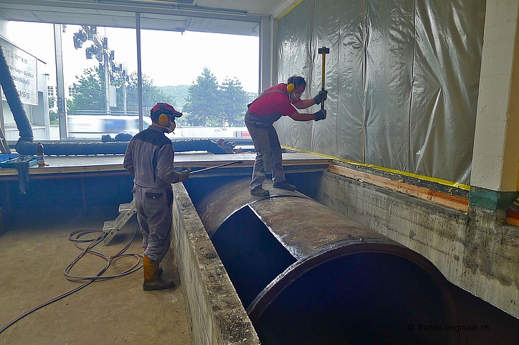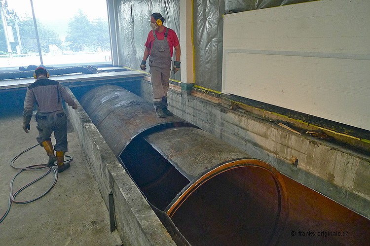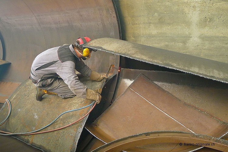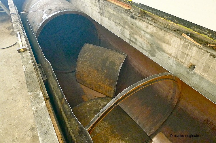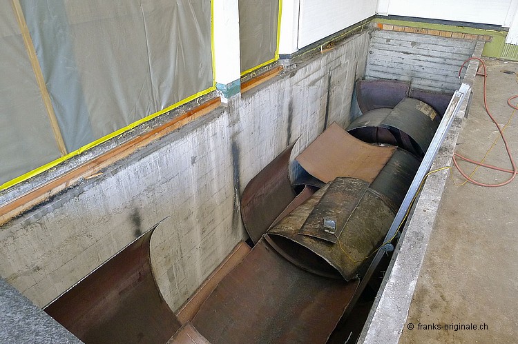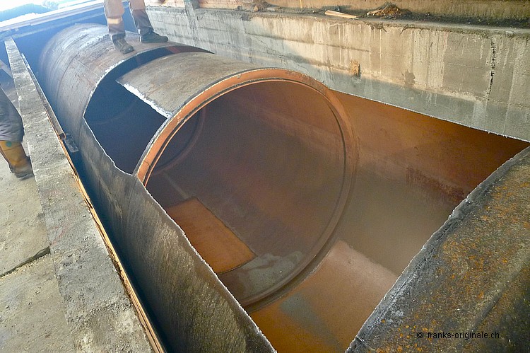 11 Meter Länge und 2.5 Meter im Durchmesser - das sind die Masse des riesen Oeltanks, der heute in viele handliche Stücke zerlegt wurde. Die beiden Arbeiter der Firma Röhner Gettnau haben dabei ganze Arbeit geleistet. Herzlichen Dank dafür! Klein - aber noch immer tonnenschwer! Für uns war dies ein eindrückiches Schauspiel. Die Schweissanlage vermochte die 5 Milimeter starke Wand des Oeltankes im Nu zu durchschneiden und aufzubrechen. Viel schneller als wir uns das vorstellen konnten .... und gegen den Abend war denn auch die grösste Arbeit schon gemacht. Die kleinen aber noch immer sehr schweren Eisenplatten liegen nun in der Wanne und warten auf den Abtransport durch den Alteisen-Sammler. Und der sollte dann morgen mit entsprechender Maschinerie bei FRANKS vorbei kommen. Mit einem Lastwagen und integriertem Kran/Greiffarm um die Eisenstücke aus der ca. 2.5 Meter tiefen Wanne heraus zu hieven. Wir sind gespannt - morgen gehts weiter! Die ganze Umbau-Geschichte können Sie auf unserer Homepage mitverfolgen - unter REFERENZEN / Franks Werkstatt sehen Sie alle Blogs dazu!