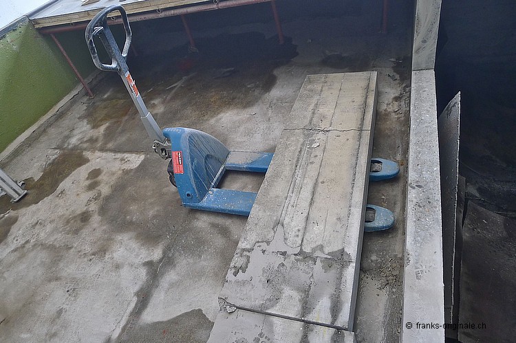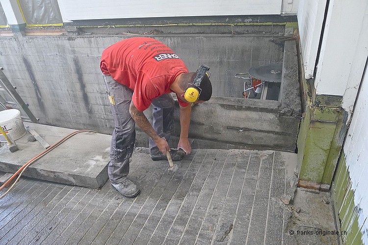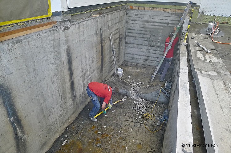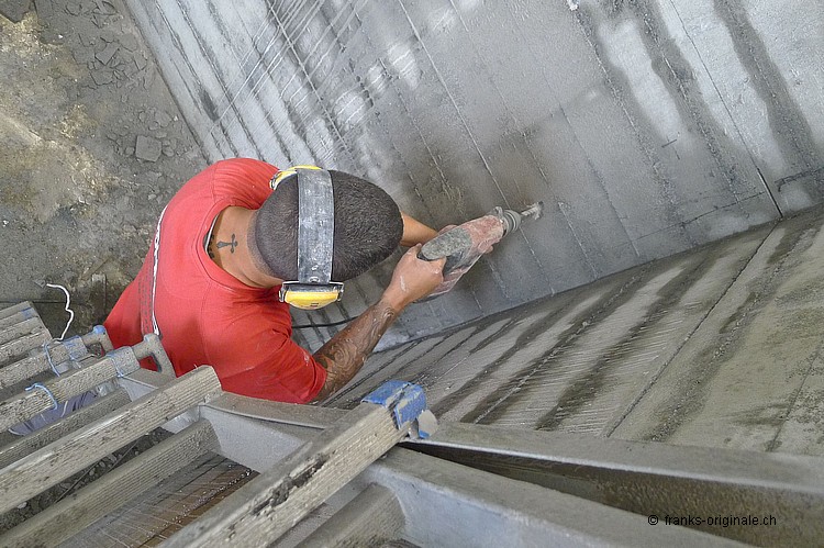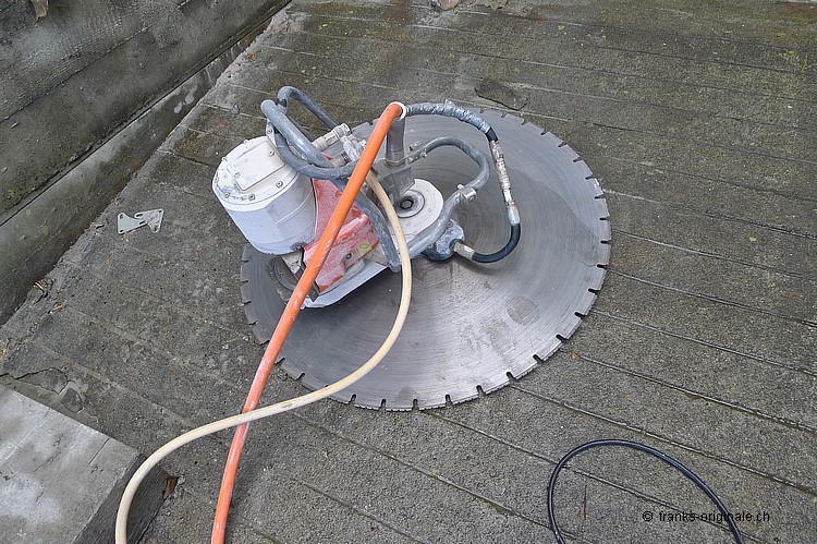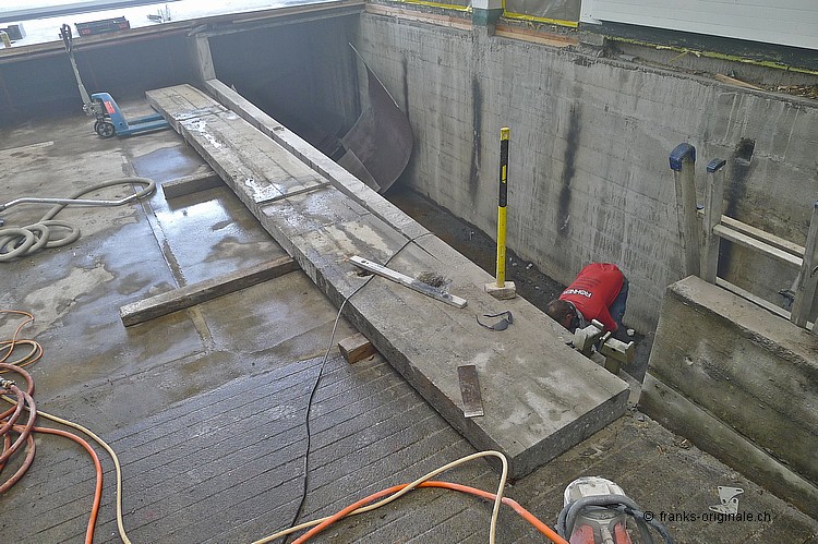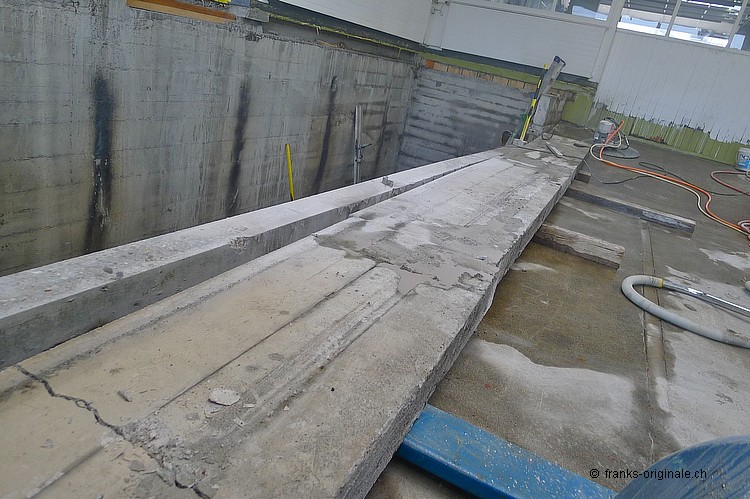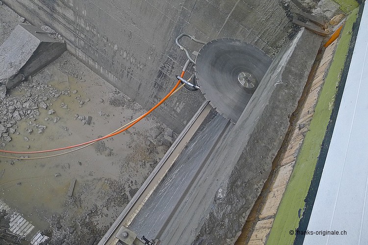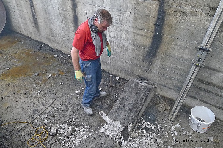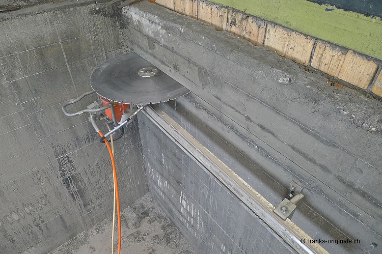 Das Fräse-Werkzeug schneidet sich Zentimeter für Zentimeter durch die Betonwand und bringt diese schlussentlich auch zu Fall. Das ist wortlwörtlich eine harte Aufgabe. Denn der Beton ist nämlich mit Eisen-Armierungen durchzogen - in diesem Fall müssen schon Diamanten her! Auch wenn es nur künstliche sind ... Lang war sie da - schnell ist sie weg! Die Betonwand resp. die Wand der Oelwanne wurde heute Morgen bereits abgebrochen. Nun sind die Stirnseite und die Beton-Auflader am Boden der Tankwanne an der Reihe. Wir sind gespannt - den morgen Freitag sollte alles fertig und sämtliche Betonteile abgebrochen und entsorgt sein. Auf ein Neues ... bis morgen! Die ganze Umbau-Geschichte können Sie auf unserer Homepage mitverfolgen - unter REFERENZEN / Franks Werkstatt sehen Sie alle Blogs dazu!